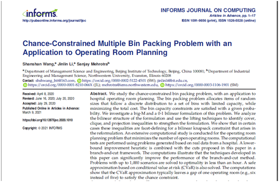 日前,北理工管理与经济学院李金林教授及其博士研究生王珊珊与美国西北大学工业工程与管理科学系Sanjay Mehrotra教授合作的研究成果“Chance-Constrained Multiple Bin Packing Problem with an Application to Operating Room Planning”近期在《INFORMS Journal on Computing》期刊在线发表。该项成果是在国家自然科学基金重点项目(71432002)支持下完成的。
