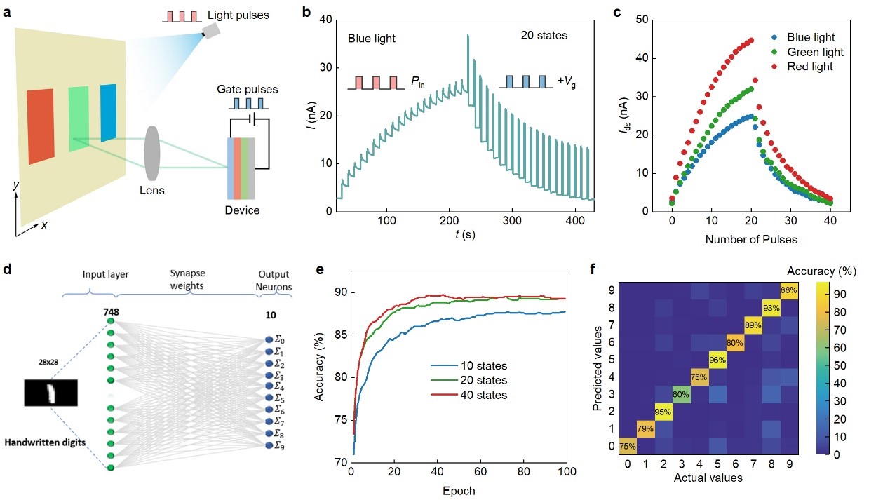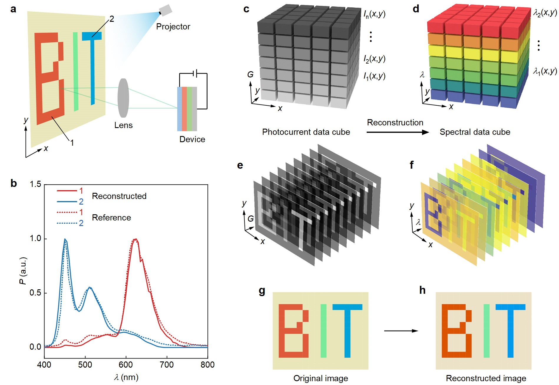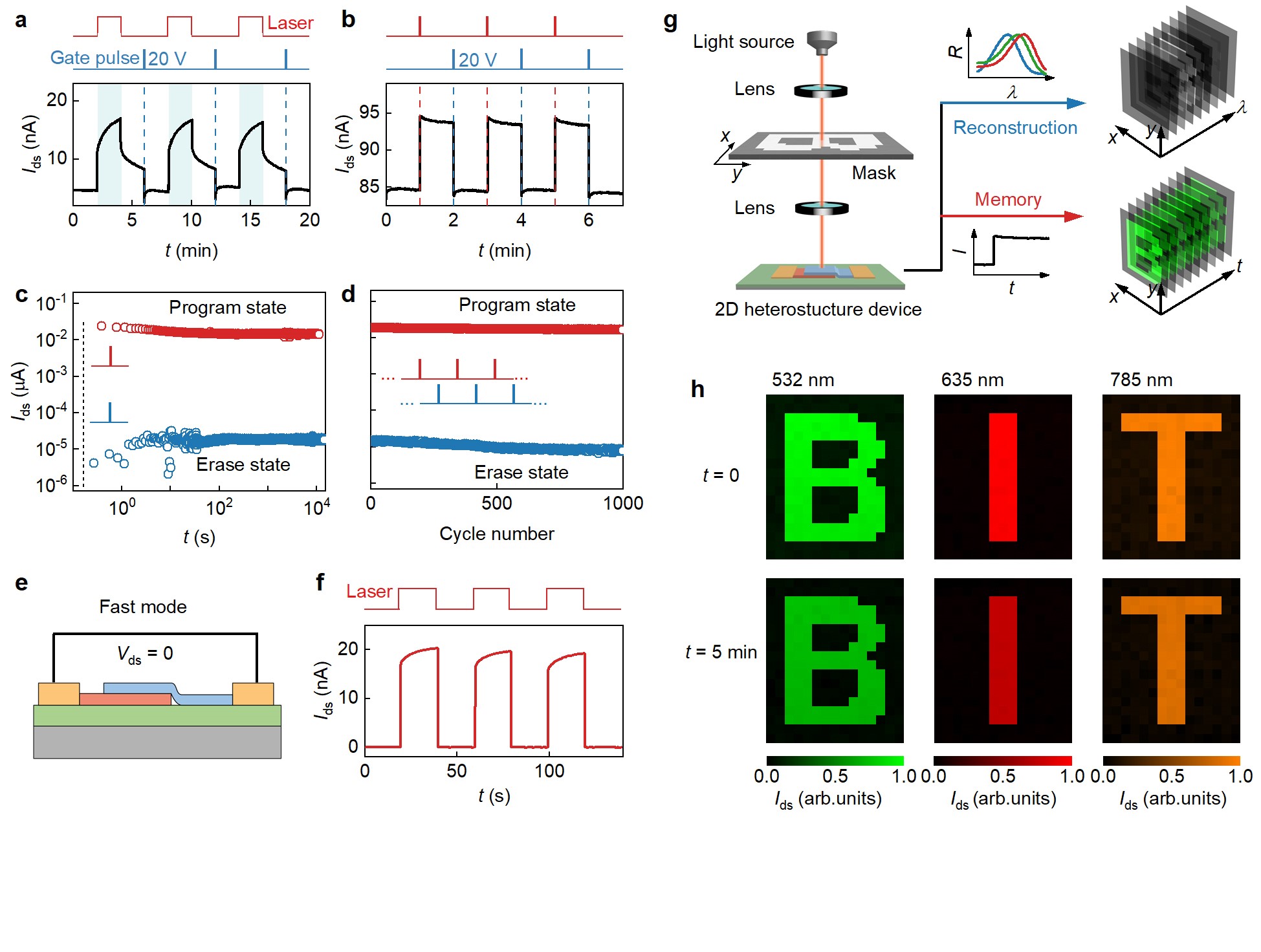 近日,北京理工大学物理学院吴汉春教授研究团队,与台湾大学/中原大学张庆瑞教授、高雄科技大学洪冠明教授、以及爱尔兰圣三一学院Igor V. Shvets教授合作,研制了一种新型范德华异质结光谱仪。该微型光谱仪不仅具有尺寸小 (19微米)、光谱分辨率高(5nm)、光谱响应范围宽(400nm-nm)、响应速度高的特点,还具有成像、存储和神经形态计算功能。相关成果以“Miniaturized spectrometer with intrinsic long-term image memory”为题,发表在国际顶级期刊《Nature Communications》上。
