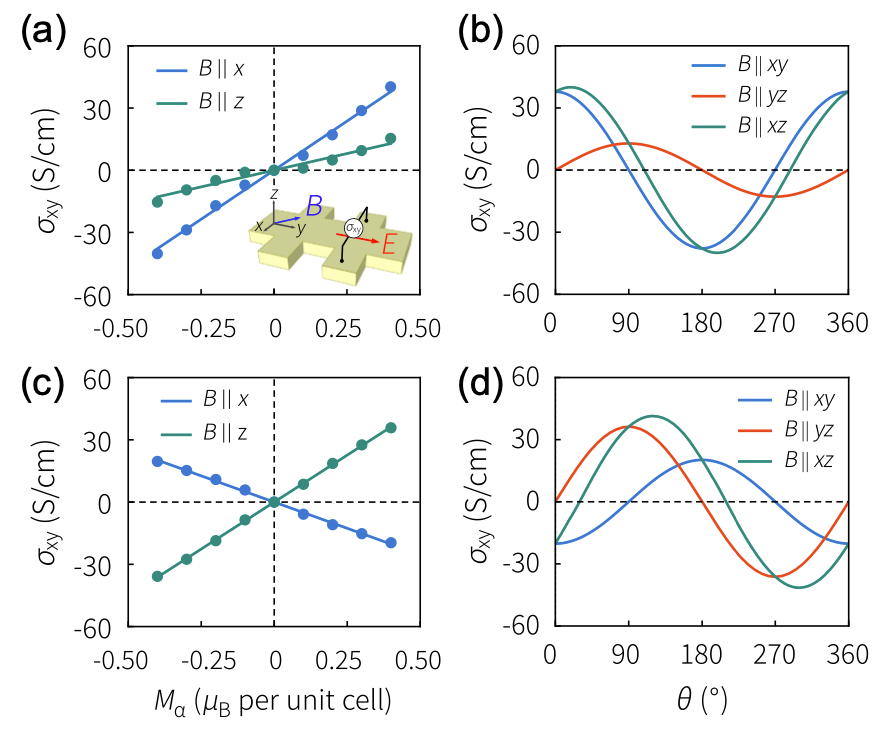 反常霍尔效应,磁性材料中最基本的输运现象之一,不仅是诸多低功耗量子效应的物理原型,也是拓扑量子物态的重要基石。姚裕贵教授二十年来一直致力于该效应的研究,在该领域做出过开拓性的工作,比如率先发展了反常霍尔效应的第一性原理计算方法;定量研究了反常霍尔效应中基于贝里曲率的内禀机制,纠正了之前“外在机制占主导,内禀机制不重要”的普遍看法,颠覆了传统认识并被独立实验证实[Phys. Rev. Lett. 92, 037204 (2004)];部分成果被写进了M. P. Marder的流行教科书《Condensed Matter Physics》;推动了该领域的迅速发展。在通常的反常霍尔效应中,磁场/磁化、电场和霍尔电流相互垂直。近期理论研究发现,面内的磁化也可以导致反常霍尔效应,(称为面内反常霍尔效应,IPAHE),然而以往IPAHE的研究主要关注具有非零磁化的铁磁或者亚铁磁系统。在应用上,净磁化为零的反铁磁系统相比铁磁或亚铁磁系统具有诸多优势,如较强的抗磁场干扰、较快的自旋动力学、以及较高的堆积密度。那么,反铁磁系统中是否也存在新奇的IPAHE值得深入研究。