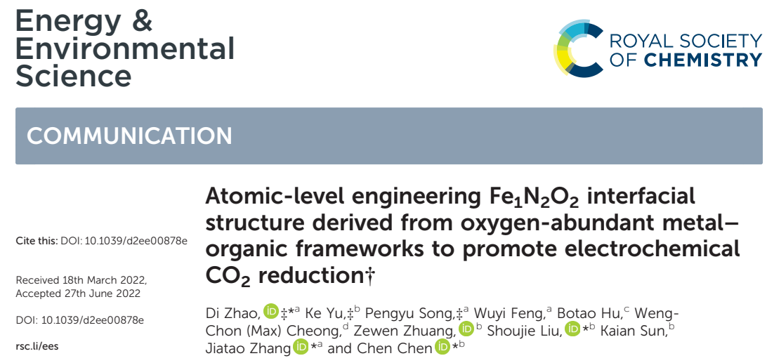 论文标题:Atomic-Level Engineering Fe1N2O2 Interfacial Structure Derived from Oxygen-Abundant Metal–Organic Frameworks to Promote Electrochemical CO2 Reduction