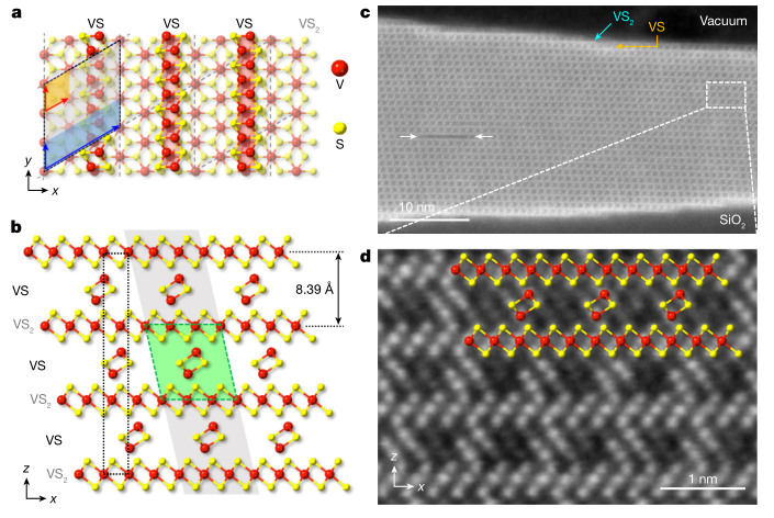 图2 VS2-VS 超晶格的原子结构。a, VS2-VS超晶格的俯视图原子模型。b, VS2-VS 超晶格的侧视图原子模型。c, VS2-VS 超晶格的横截面 ADF 图像。d, c中白色矩形的放大 ADF 图像,与原子模型结构一致。