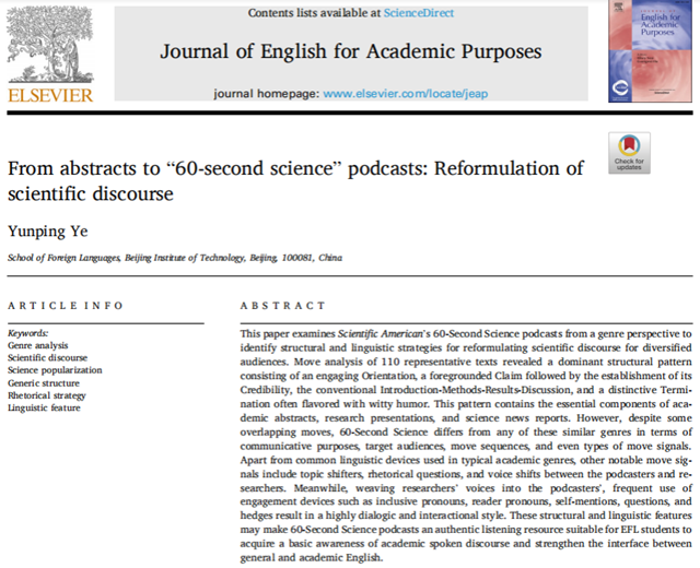 近日,北京理工大学外国语学院叶云屏教授关于科学话语再建构的原创研究成果...