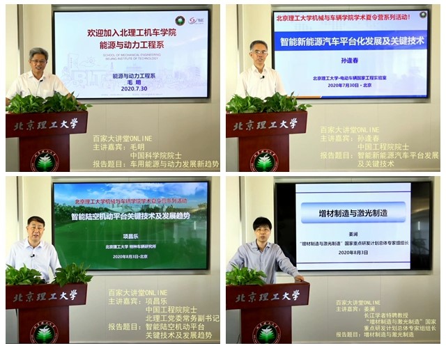 7月30日上午,北理工机械与车辆学院优秀大学生暑期夏令营院士长江系列学术报告会正式启动,学术报告会也是学院迎八十周年校庆系列庆祝活动之一,学术报告依托研究生院“百家大讲堂ONLINE”平台,并通过北理工官方B站进行直播。中国兵器工业第二〇一研究所研究员、中国科学院院士、北理工双聘院士毛明,北理工教授、中国工程院院士孙逢春分别做了《车用能源与动力发展新趋势》和《智能新能源汽车(NEV)平台发展及关键技术》的学术报告。8月3日上午,北理工党委常务副书记、中国工程院院士项昌乐,北理工机械与车辆学院院长姜澜分别做了题目为《智能陆空机动平台关键技术及发展趋势》和《增材制造与激光制造》的学术报告。