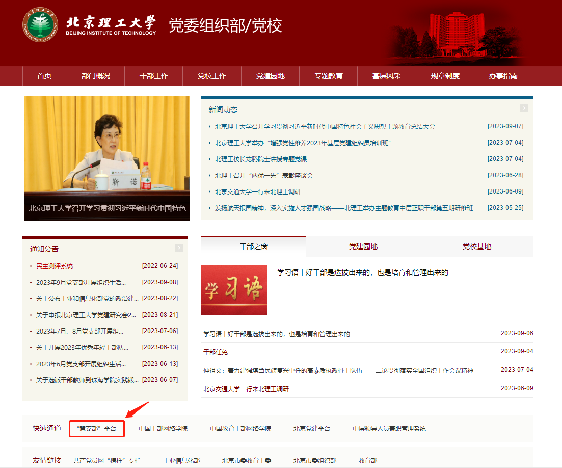 2. 登录入口:PC端:输入http://zhdzb.bit.edu.cn/或通过组织部网站“慧支部”平台入口进入。