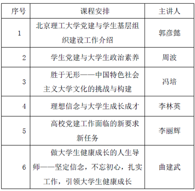本次专题培训为期四天,先后邀请到了北京理工大学学生工作部部长郭彦懿、北京理工大学组织部副部长、党校副校长周波、首都经济贸易大学党委书记冯培、北京理工大学马克思主义学院院长、博士生导师李林英、北京市委教育工委组织处处长李丽辉、大连海事大学辅导员曲建武教授分别以“我校党建与学生基层组织建设工作介绍”、“高校党建工作面临的新要求新任务”、“胜于无形——中国特色社会主义大学文化的挑战与构建”、“理想信念与大学生成长成才”、“学生党建与大学生政治素养”和“做好大学生健康成长的人生导师”为主题做了4场专题报告、2场经验交流。