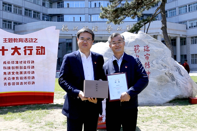 张军校长为杨世泽颁发校外辅导员聘书,并赠送了《北京理工大学校史丛书》。