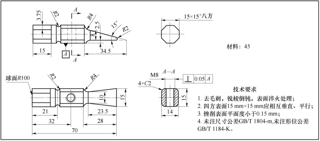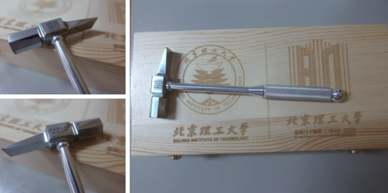 锤柄为铝合金材质,历经下料、 车端面、车外圆、车锥面、车螺纹、车球头以及滚花等工艺过程;锤头为45钢材质,历经划线、锯削、锉削、钻孔、攻丝、表面淬火处理等工艺过程;锤头两侧采用激光雕刻技术分别刻有八十周年校庆标志和“北京理工大学建校八十周年”字样,以此体现学校八十载实践育人成就,弘扬“精工”品格。