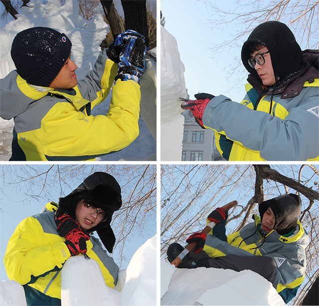 1月4日上午,大赛进入正式比赛阶段。比赛中,雪雕队员夜以继日的奋战在雪雕大赛最前线,将全部精力集中于作品的创作之中,每天工作时间超过10个小时。1月6日,比赛进入攻坚阶段,队员们在零下20多度的严寒中,克服生理、心理双重挑战,彻夜奋战至次日凌晨4点,经过近20小时的奋战,雪雕作品顺利完成。