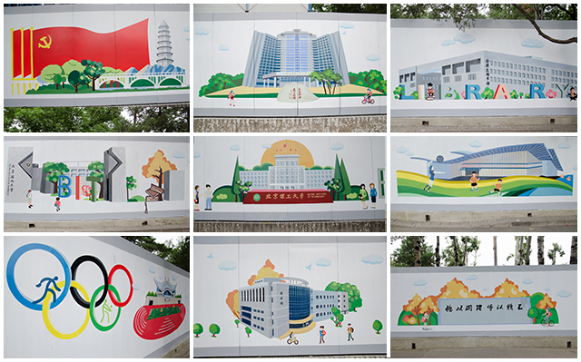 6月20日,北理工设计与艺术学院的师生在毕业季为母校献上了一份特殊的礼物,他们让中关村校区新校医院工地一百余米的灰白彩钢围挡摇身变成漂亮的校园文化墙,在校园中展示北京理工大学的往昔峥嵘岁月和现在的美丽校园。