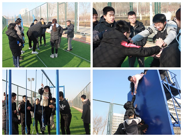 此次心理素拓活动以提升团体凝聚力为主题,包含“破冰活动”“齐心协力”“脚吊环行走”“翻越四米墙”等环节。“破冰活动”环节,通过“团队按摩操”“群口相声”等一系列小游戏,同学们打破了心理壁垒,心理意义上的团体初步形成;“齐心协力”和“脚吊环行走”活动中,同学们热烈讨论如何完成任务,并在完成任务时相互提供协助和保护,团体凝聚力在克服困难的过程中快速提升;最后的“翻越四米墙”环节,13名队员相互配合全部登上4米的高墙,圆满完成此次素拓活动的各项任务。