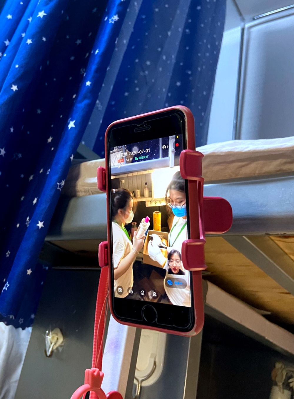 在北京理工大学一间女生宿舍里,设计与艺术学院的老师朱彦蒙,正对着手机与屏幕中的一位同学交流。手机用自拍杆架在宿舍床边,视频中的女孩是该学院毕业生孙嘉,身在辽宁家中。