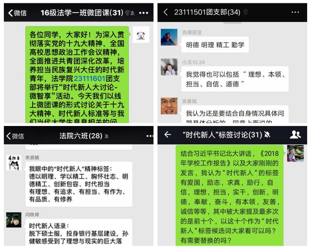 为深入贯彻落实党的十九大精神、全国高校思想政治工作会议精神,全面推进共青团深化改革,团结带领广大团员青年听党话、跟党走,培养担当民族复兴大任的时代新人,法学院于2018年6月,在全院范围内组织各团支部广泛开展了“时代新人大讨论”微智享活动。