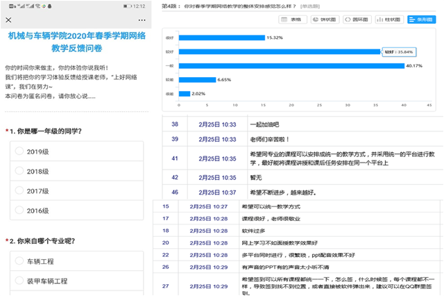 2月4日,根据学校疫情防控总体安排,学校决定延期开学不停课,教师按原上课时间通过网络教学授课。机械与车辆学院第一时间成立由学院院长、党委书记担任组长的网络教学保障组,吹响了这场“网络教学战役”的集结号。1-4周内96位授课教师,117个教学班,覆盖7666名学生,面对艰巨的网络教学任务,学院充分借助专业和研究所基层教学组织,紧密依靠教师,多次召开联席会议,及时传达学校要求,加强部署和联动,将所有教师的思想统一到学校的大局工作中。学院相继开展了“明标准、搭平台、建渠道、塑模式、享资源、勤督查、重反馈、保服务”八项工作,全力准备迎接开学第一课。