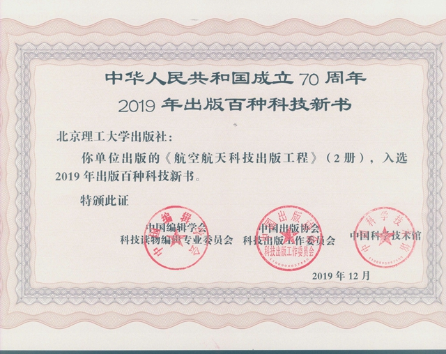 编辑:霍书博 审核:林杰 阅读次数:近日,中华人民共和国成立70周年科技出版十件大事暨2019年出版百种科技新书发布会在京举行,北理工出版社出版的《空间科学与技术研究丛书》《近感探测与毁伤控制技术丛书》《航空航天科技出版工程》三套图书入选“2019年国家出版百种科技新书”。