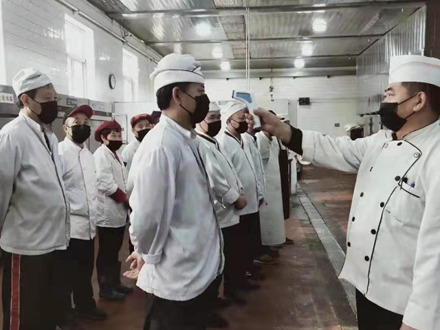 “清晨5点,教工食堂经理胡文烈已经开始为每一位员工测量体温,确保上岗前人人消毒、佩戴口罩......晚上8点,送走最后一批就餐师生,完...