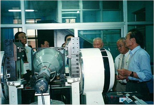1995年211工程验收期间,祁载康(右一)向专家介绍实验室建设情况